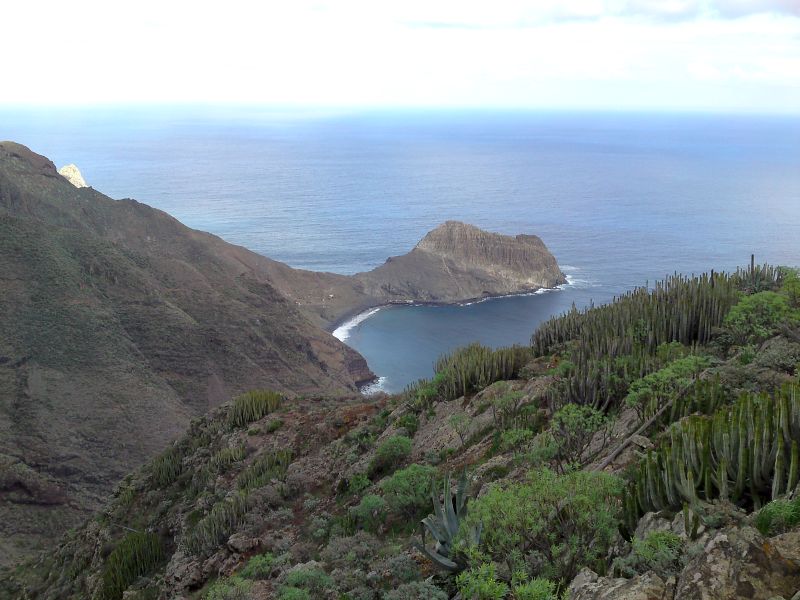 Zitat"Der Weiler Las Palmas ist fast verlassen. Er ist umgeben von einem Opuntienhain (Feigenkakteen) mit riesigen Exemplaren. Von den Dattelpalmen, die der Ansiedlung den Namen gaben, sind nur noch einige vorhanden. Der Blick auf die Küste mit den sich brechenden Wellen und auf den „Vogelfelsen“ Roque del Dentro ist herrlich und so nah. Schon von der Punta de Hidalgo kann man ihn ja sehen."