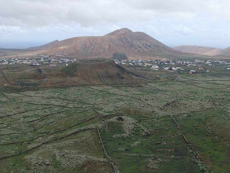 In nordöstlicher Richtung hinter Morro de los Ricones die Montana Escanfrage, die Montana Caima und die Montana Roja. Unten rechts die Häuser von Guisgey.